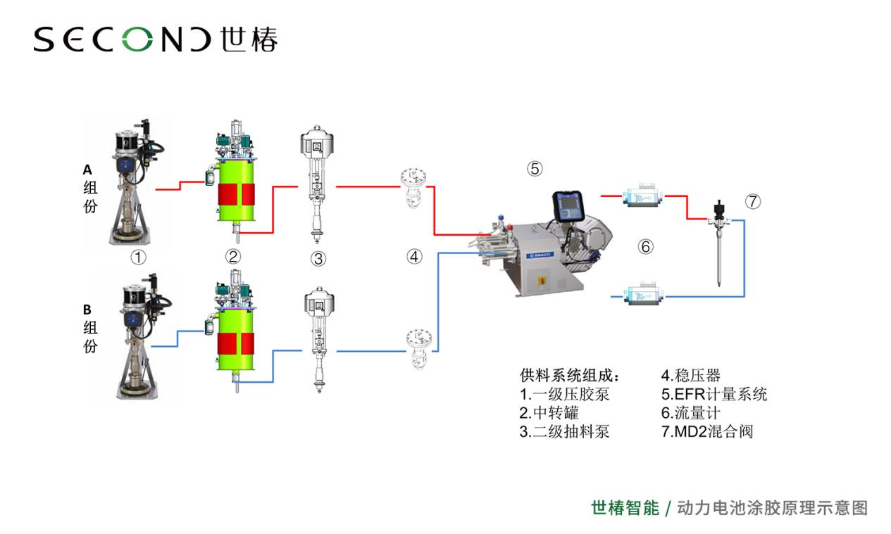 世界杯现场直播平台智能动力电池涂胶机设备主体由上料系统、中转系统、供料系统、计量系统、分配系统等组成,搭配缺料监控、压力监控、流量监控等功能,通过软件控制和信息化管理(MES系统)集成为一个具备胶水原料处理、精确计量、自动混合的涂胶机,具备出胶连续均匀、高稳定、高精度、高耐磨等优势性能,有效提高了产线的整体生产效率。