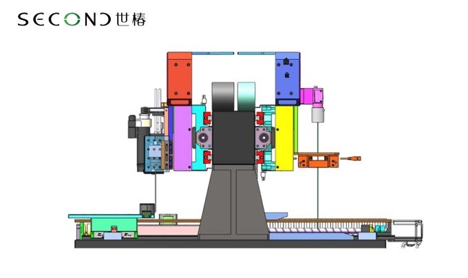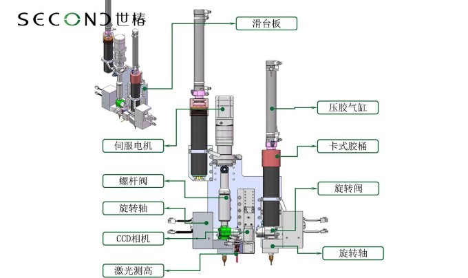点胶组件具有如下技术特点:一是设备集成两套点胶组件,通过气缸驱动切换,模块主要由两套300cc气缸供胶系统、螺杆阀、两套旋转点胶头、气缸滑台组件、CCD相机、激光测高模块、和离子风清洁模块等组成;二是供胶系统(1)由气缸压胶+300cc卡式胶桶组成,搭配世界杯现场直播平台精密控制器,可精确调节供胶压力,保证供胶稳定,具备缺胶报警功能,供胶系统(2)由气缸压胶+旋转点胶头组成,搭配世界杯现场直播平台精密控制器使用;三是采用螺杆阀计量,出胶量精准,可连续出胶;四是旋转点胶头由步进电机驱动,可使针头旋转,用于特殊角度点胶,同时模块集成陶瓷旋转阀,用于快速切断胶路,改善胶水拉丝;五是配备CCD视觉相机,用于产品定位,识别产品角度,引导设备点胶,同时用于点胶状况检测;六是配备激光测高功能,检测产品是否有变形、翘边等情况并自动补偿高度,保证涂覆效果;七是离子风用于清除产品表面灰尘、油污等,活化产品表面,提高表面粘接能力。