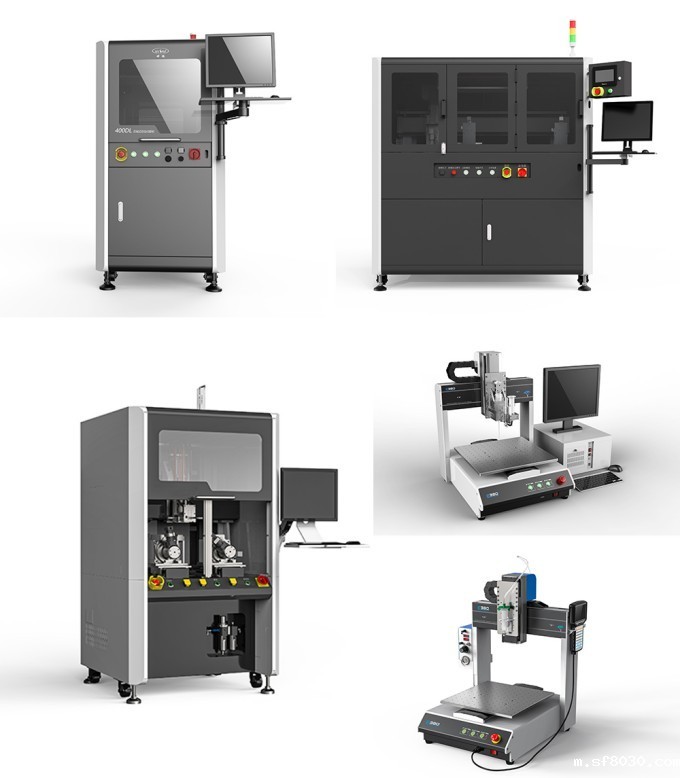 其中在线五轴设备,为公司新推出产品,具有画点、线、面、弧、圆、不规则曲线连续补间及三轴/五轴联动功能;具有影像自动靶标定位,涂胶路径位置显示和追踪功能;具有Mark点影象自动对位和Z轴高度探测功能;依制程需要,还可加装真空清洗、自动对针、高度检测、胶量检测(缺胶报警)、3D线激光胶线检测、3D线激光胶路引导系统等功能……