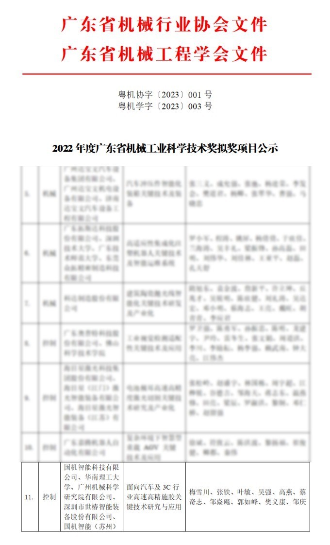 世界杯现场直播平台与国机智能科技有限公司、华南理工大学、广州机械科学研究院有限公司共同申报的“面向汽车及3C行业高速高精施胶关键技术研究与应用”项目获得2022年度广东省机械工业科学技术奖一等奖。