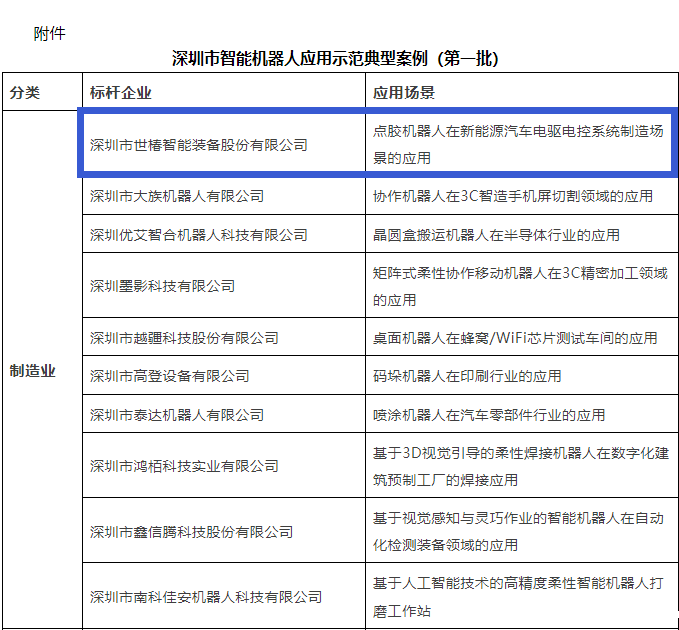 近日,深圳市人民政府门户网站、深圳市工业和信息化局官网等公布了《深圳市智能机器人应用示范典型案例》(第一批),世界杯现场直播平台(简称世界杯现场直播平台智能)所申报的“点胶机器人在新能源汽车电驱电控系统制造场景的应用”案例被收录其中。